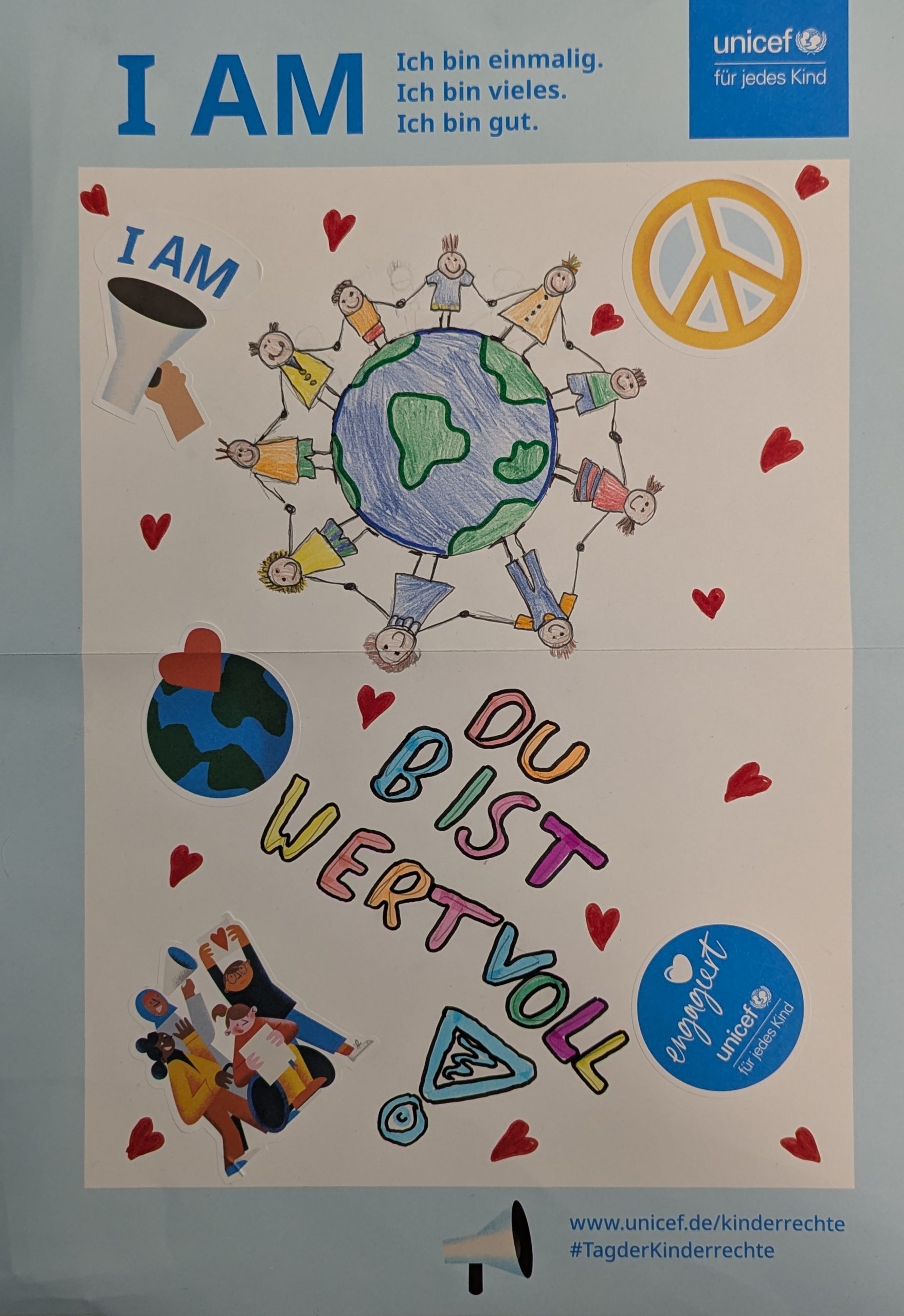Wusstest du, dass die Kinderrechte weltweit jeden Tag missachtet werden, obwohl sie seit 1989 in der Kinderrechtskonvention verankert sind? Und wusstest du auch, dass die Kinderrechte noch immer nicht im Grundgesetzt stehen? Dabei sind diese so wichtig, weil sie Basis dafür sind, dass Kinder sicher, gesund und frei aufwachsen können und niemand ihre grundlegenden Bedürfnisse verletzt. Denn sie müssen genauso respektiert und ernst genommen werden wie Erwachsene. Gerade jetzt, wo die Klimakrise, Kriege, extreme Armut und Hunger dazu führen, dass die Situation von Kindern weltweit immer schwieriger wird, muss darauf aufmerksam gemacht werden. Deshalb hat UNICEF zum diesjährigen Tag der Kinderrechte am 20. November die Aktion I AM gestartet, an der wir uns, die Klasse 7d, beteiligt haben. Schaut euch gerne die Poster im Schulflur an. Sie sagen aus: Ich bin einzigartig, ich bin wichtig! Und weil das so ist, veranstalten wir am 17.12. auch noch einen Kuchenbasar, dessen Einnahmen wir an UNICEF spenden wollen, damit das Geld von der Organisation für weitere Kinderhilfsaktionen verwendet werden kann. Also, auch du kannst helfen, indem du unseren Kuchen (kaufst) isst!