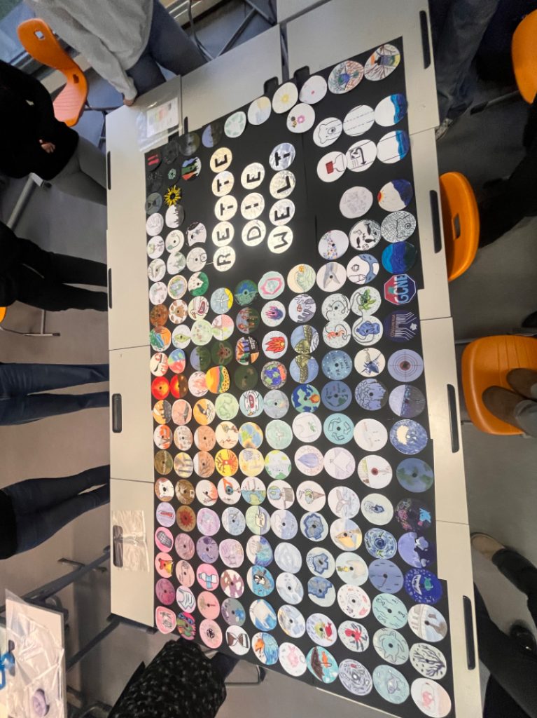 Statt klassisch auf Papier oder Leinwand zu arbeiten, gestalten wir rund zweihundert alte Schallplatten, die zunächst grundiert, anschließend individuell bemalt und schließlich an der Wand befestigt werden. Jede Schallplatte steht für eine eigene künstlerische Auseinandersetzung mit Umwelt, Natur, bedrohte Tiere, Energie und Ressourcen. Erst gemeinsam ergeben sie ein großes, farbenfrohes Gesamtbild, das zeigt, wie vielfältig Umwelt gedacht werden kann.